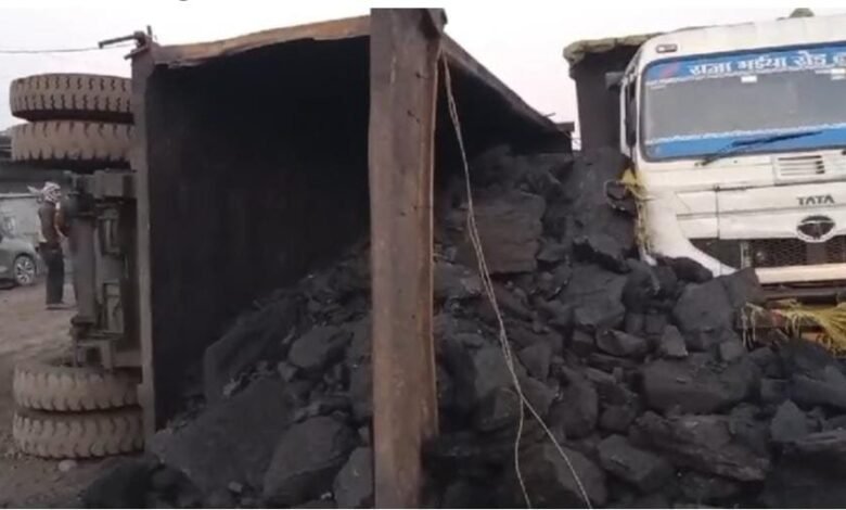इमली छापर चौक पर कोयला लोड ट्रेलर पलटने से हड़कंप, चालक को मामूली चोटें।