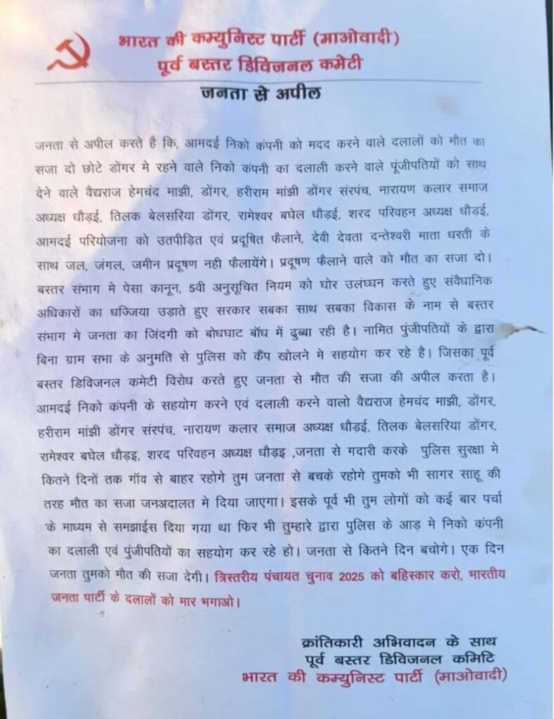 नक्सलियों ने पर्चा फेंक कर दूसरी बार दी धमकी