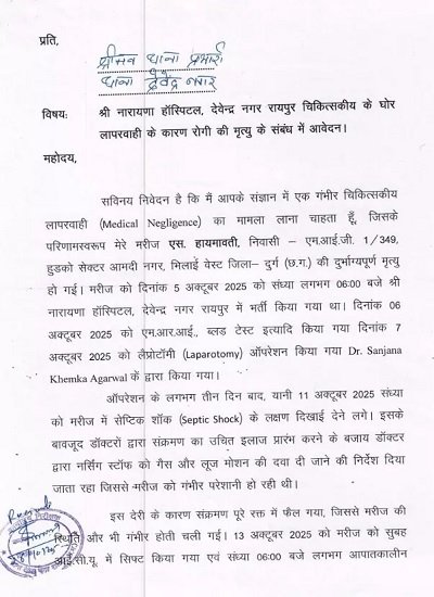 रायपुर के डॉक्टर की लापरवाही से पूर्व सैनिक की पत्नी की मौत