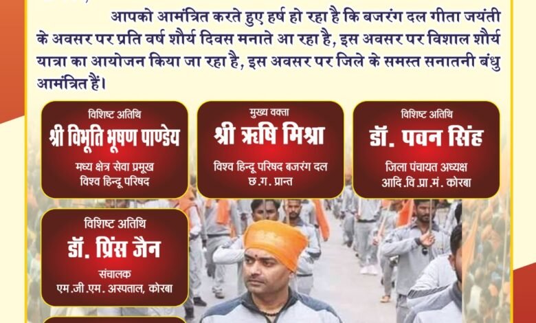 कोरबा। हिन्दू समाज की एकता, शौर्य और सांस्कृतिक चेतना को सशक्त करने के उद्देश्य से विश्व हिन्दू परिषद एवं बजरंग दल, कोरबा द्वारा दिनांक 27 दिसंबर को शौर्य संचलन का भव्य आयोजन किया जा रहा है।