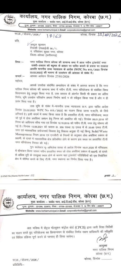 नगर निगम आयुक्त द्वारा जारी आधिकारिक पत्र में यह स्वीकार किया गया है कि नवीन ट्रांसपोर्ट नगर परियोजना से संबंधित विषय सामान्य सभा में प्रस्तुत किया गया है, हालांकि निगम ने यह भी स्पष्ट किया है कि अभी किसी प्रकार का अंतिम निर्णय, भूमि उपयोग परिवर्तन या निर्माण कार्य स्वीकृत नहीं किया गया है। निगम ने यह भी कहा है कि माननीय उच्च न्यायालय, छत्तीसगढ़ द्वारा पारित आदेश दिनांक 03.02.2023 (WPC No. 615/2023) का पालन करना अनिवार्य है तथा Central Pollution Control Board (CPCB) के दिशा-निर्देशों के अनुरूप ही कोई निर्णय लिया जाएगा। ऐसे में बड़ा सवाल है कि क्या नवीन ट्रांसपोर्ट नगर बसाने की योजना सिर्फ वाहवाही लूटने का माध्यम है ?