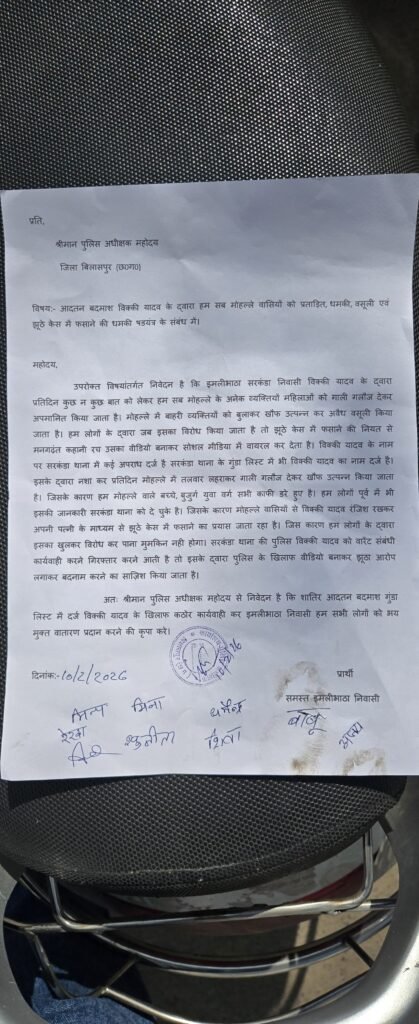 आतंक से भयभीत इमलीभाठा के रहवासी सामूहिक रूप से एसपी कार्यालय पहुंचे और लिखित शिकायत सौंपकर क्षेत्र को भयमुक्त करने की मांग की। शिकायत में अवैध वसूली, धमकी, झूठे मामलों में फंसाने की चेतावनी और सोशल मीडिया के जरिए बदनाम करने जैसे आरोप शामिल हैं।